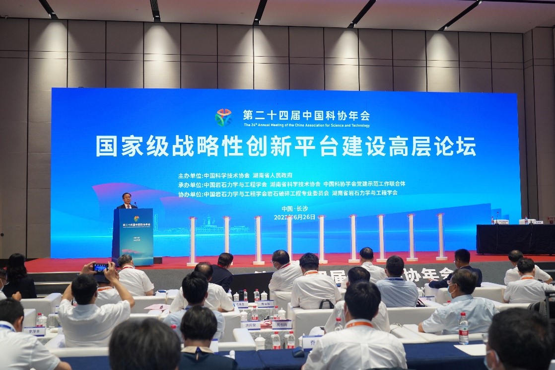 2022年6月26日,由中国科学技术协会、湖南省人民政府主办,中国岩石力学与工程学会、湖南省科学技术协会、中国科协学会党建示范工作联合体承办,中国岩石力学与工程学会岩石破碎工程专委会、湖南省岩石力学与工程学会协办的第二十四届中国科协年会"国家级战略性创新平台建设"高层论坛在湖南长沙成功举办。本次论坛以国家重大工程战略性需求为导向,推进创新体系优化组合,在推动重组"全国重点实验室"、科技创新与实体经济深度融合等方面积极探索、勇于挑战、大胆创新。