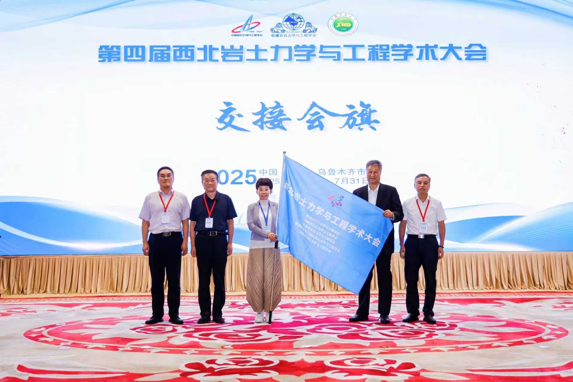 受学会党委书记、理事长何满潮院士委托,监事长赵阳升院士出席开幕式并致辞,他表示,本次学术大会是响应“西部大开发战略深入推进”需求的具体实践,西北地域特殊的地质条件—从冻土、黄土到沙漠地貌,从高陡边坡到深埋隧洞,既是岩土工程领域的“天然实验室”,也承载着国家能源、交通、水利等重大工程的建设使命。本次大会正是立足这一背景,为解决西北特殊岩土、地质灾害防治、岩土文物保护等“卡脖子”问题搭建了高水平交流平台。希望各位与会代表在交流中碰撞思想、凝聚共识,为西北岩土工程高质量发展贡献智慧。 本届大会以“岩土智慧齐聚丝路 工程创新共筑新程”为主题,设立15项专题,聚焦西部滑坡高边坡、冻土与黄土力学、TBM穿越断层破碎带、丝绸之路岩土文物保护等关键难题,组织了1个主旨报告、5场18个特邀报告、4个分会场31个报告、2场研究生论坛19个报告,集中发布最新研究成果,持续为西部重大工程提供学会智库支持。 学会党委委员、副理事长邬爱清教授级高工,新疆、陕西、山西、甘肃和河北省学会的理事及200余名来自全国高校、科研院所及企业的代表参会。 在大会闭幕式上举行了会旗的交接仪式,下一届西北岩土力学与工程学会将于2026年在河北举办,由河北省岩土力学与工程学会承办。作为西北地区规模最大、影响力最广的岩土工程学术平台,大会将持续推动区域协作,致力于在“双碳”目标指引下发展绿色岩土工程技术,为西部重大工程建设和国家战略实施贡献核心科技力量。